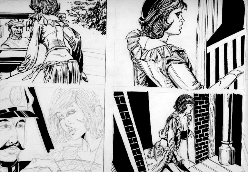 un fumetto vero. Le tavole venivano realizzate su un foglio da disegno a matita e poi ripassate con un pennino e inchiostro di china. Questi pennini, ora introvabili, permettevano segni fini o spessi a seconda della pressione, e con il pennello fine si creavano le ombre e le grosse zone scure. |