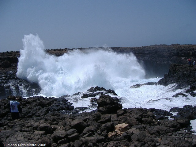 ![]() Capo Verde, Isola Sal, Burracona, 2006 Ricordo sempre con emozione il viaggio a Capo Verde, e precisamente all'Isola di Sal. Una piccola isola vulcanica abitata, con vegetazione scarsa, praticamente desertica, ma con vaste spiagge sabbiose e coste rocciose. Il posto fotografato si chiama 'Burracona' e la forza dell'oceano ha scavato la roccia vulcanica, e le grosse onde atlantiche colpiscono con forza la roccia creando alti spruzzi. Osservate il confronto tra lo spruzzo e la persona in basso a sinistra intenta a fotografare. |