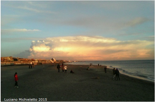 ![]() Ostia (Roma), 2015 Foto effettuata dal Pontile. Sono stato attirato dalla grossa nuvola sullo sfondo. Siamo quasi al tramonto, e la sua forma e i suoi colori creano una magia irripetibile. |